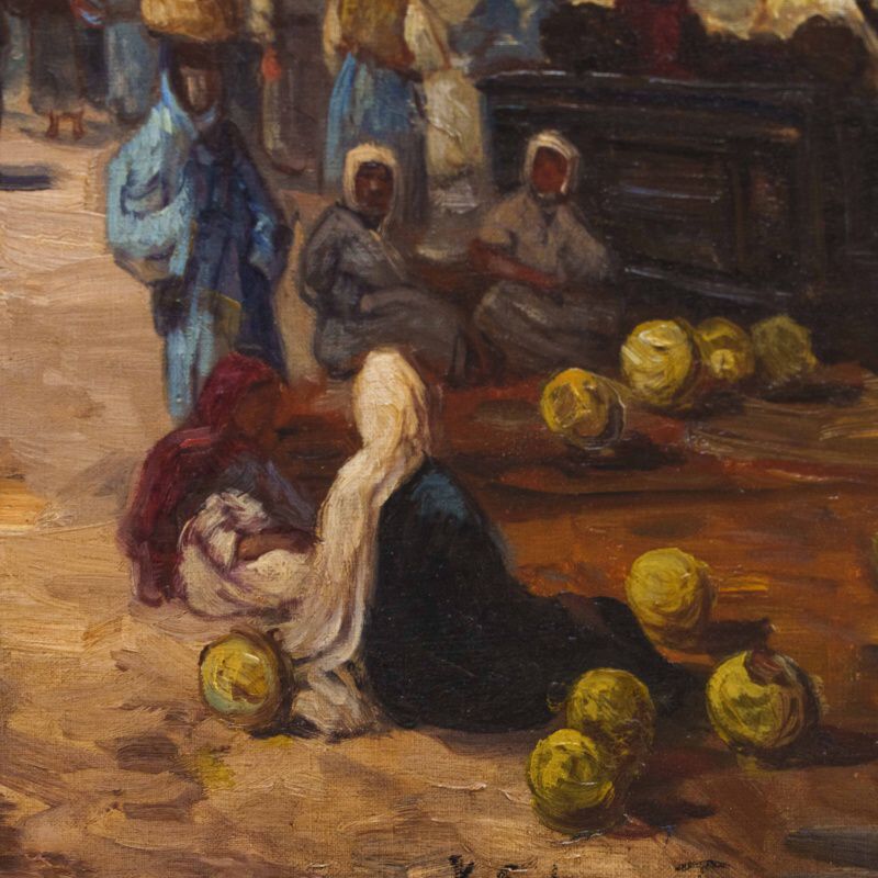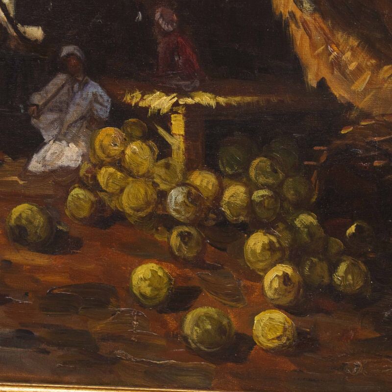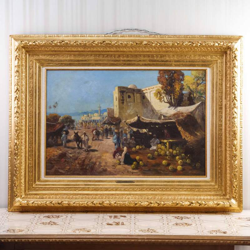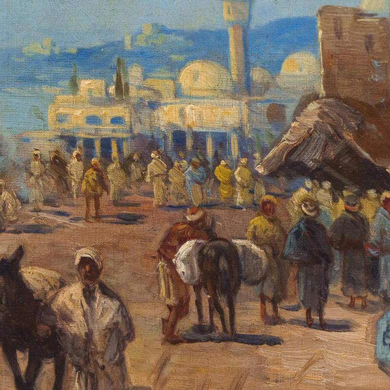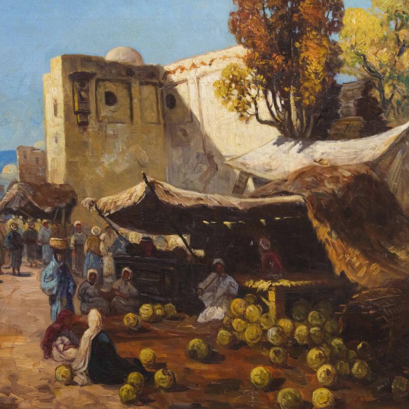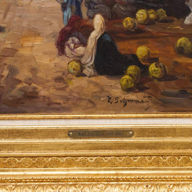 Представлено живописное произведение с условным названием «Восточный базар» известного австрийского художника Karl Kaufmann. Авторская подпись K. Schwarz( один из самых известных официальных псевдонимов художника Карла Кауфманна), подтверждающая подлинность картины, находится в правом нижнем углу.