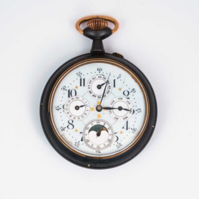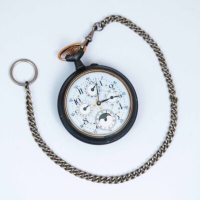 Кумган представляет собой элегантный латунный сосуд с высоким горлышком и изогнутым носиком, украшенный сложным орнаментом и вставками с синими ювелирными вставками, которые добавляют ему изысканности.