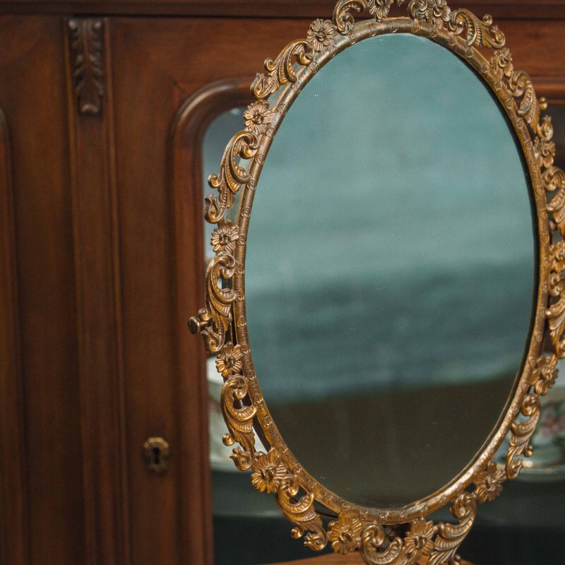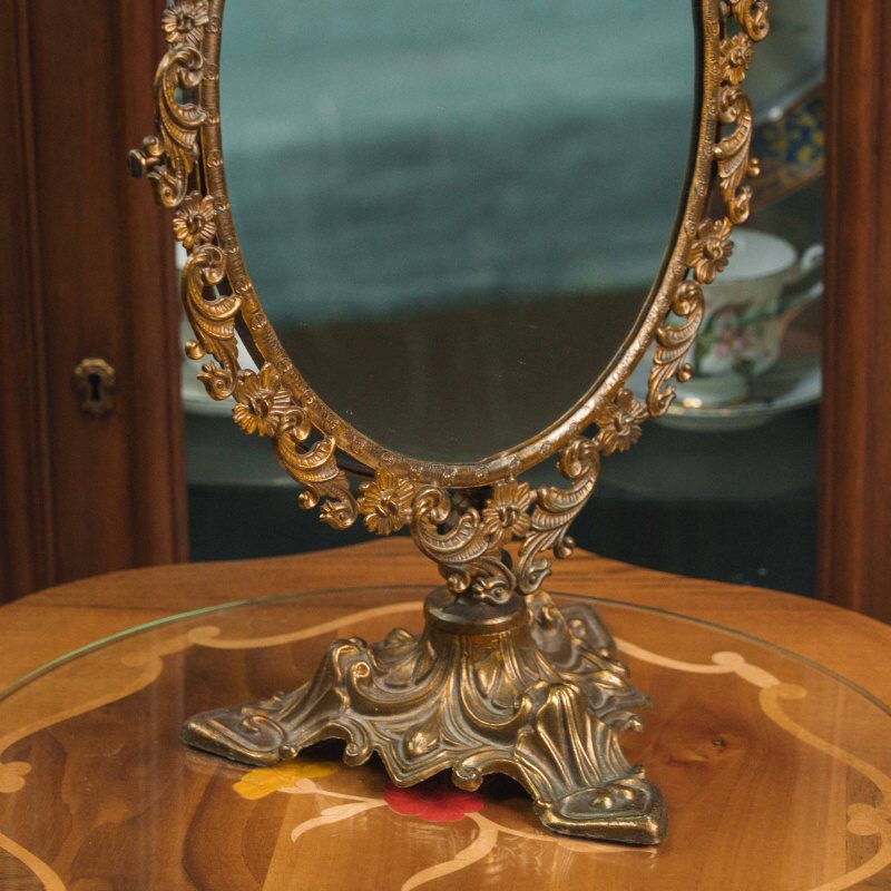 Настольное зеркало из бронзы предстает как эффектный декоративный предмет, созданный в пышной эстетике позднего историзма. Оно выполнено из массивного бронзового литья тёплого тёмно-золотистого оттенка, а его главное выразительное качество — богатая, практически скульптурная рама. Круглый зеркальный диск обрамлён плотным орнаментальным поясом, состоящим из чередующихся завитков, акантовых листьев и мелких декоративных выступов, создающих сложную волнообразную линию по окружности. Орнамент густой и рельефный, благодаря чему зеркало производит впечатление драгоценного интерьерного акцента.