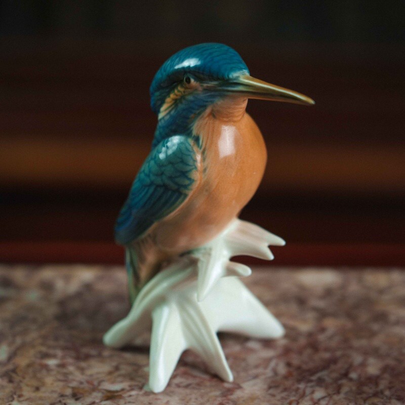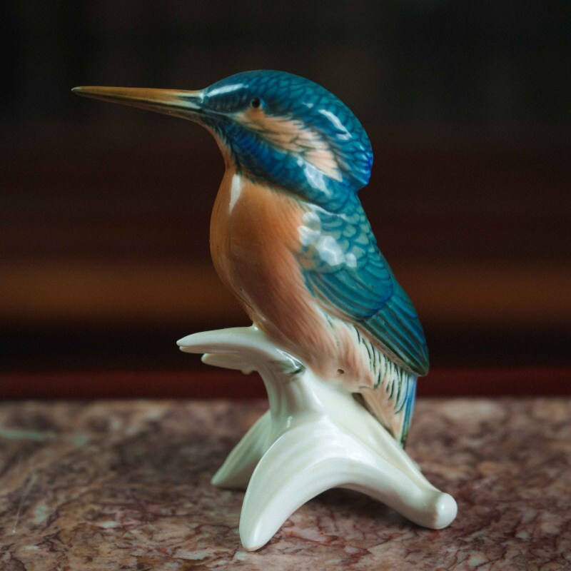 Изящная фарфоровая статуэтка зимородка, выполненная на знаменитой немецкой мануфактуре Karl Ens (Тюрингия, Германия). Птица представлена в характерной позе — она сидит на стилизованной ветке, с гордо поднятой головой и слегка наклонённым длинным клювом. Мастерство росписи поражает реалистичностью: насыщенные синие и бирюзовые оттенки крыльев и головы контрастируют с теплым охристо-оранжевым тоном груди, а плавные переходы цвета подчёркивают естественную красоту оперения. Белая основа фарфора служит гармоничным фоном, позволяя ярким краскам заиграть особенно выразительно.