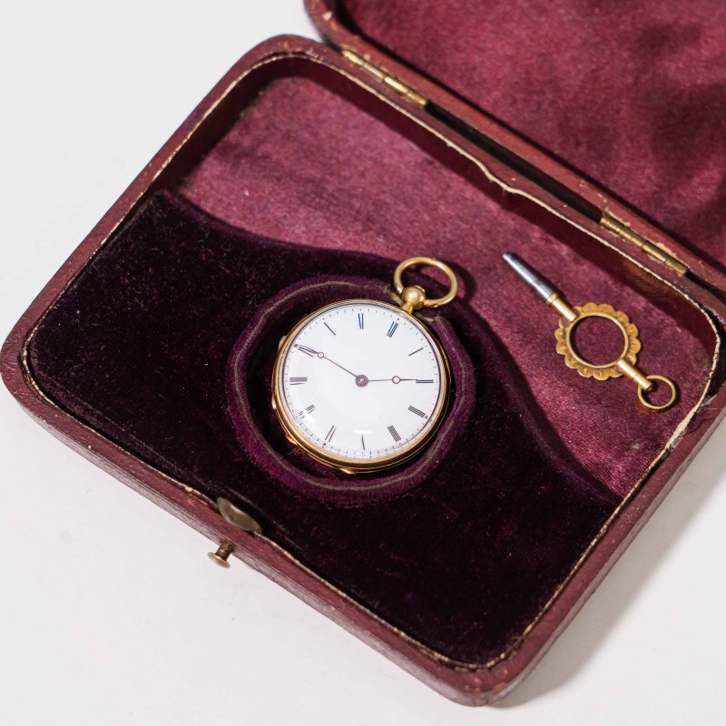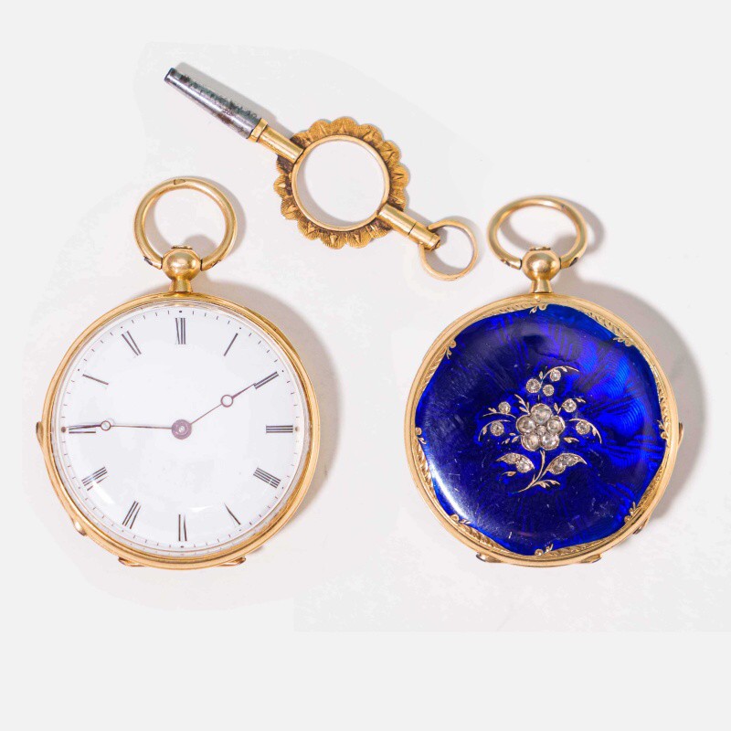 Исполненные на высочайшем уровне, карманные часы сочетают в себе элементы стиля XIX века. Корпус золотой, с шикарной синей эмалью и красивым цветочным орнаментом, с бриллиантами, на задней крышке.