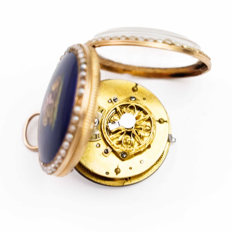 Изящный гильошированный золотой корпус, контур передней крышки инкрустирован мелким жемчугом, задняя крышка оформлена синей эмалью.